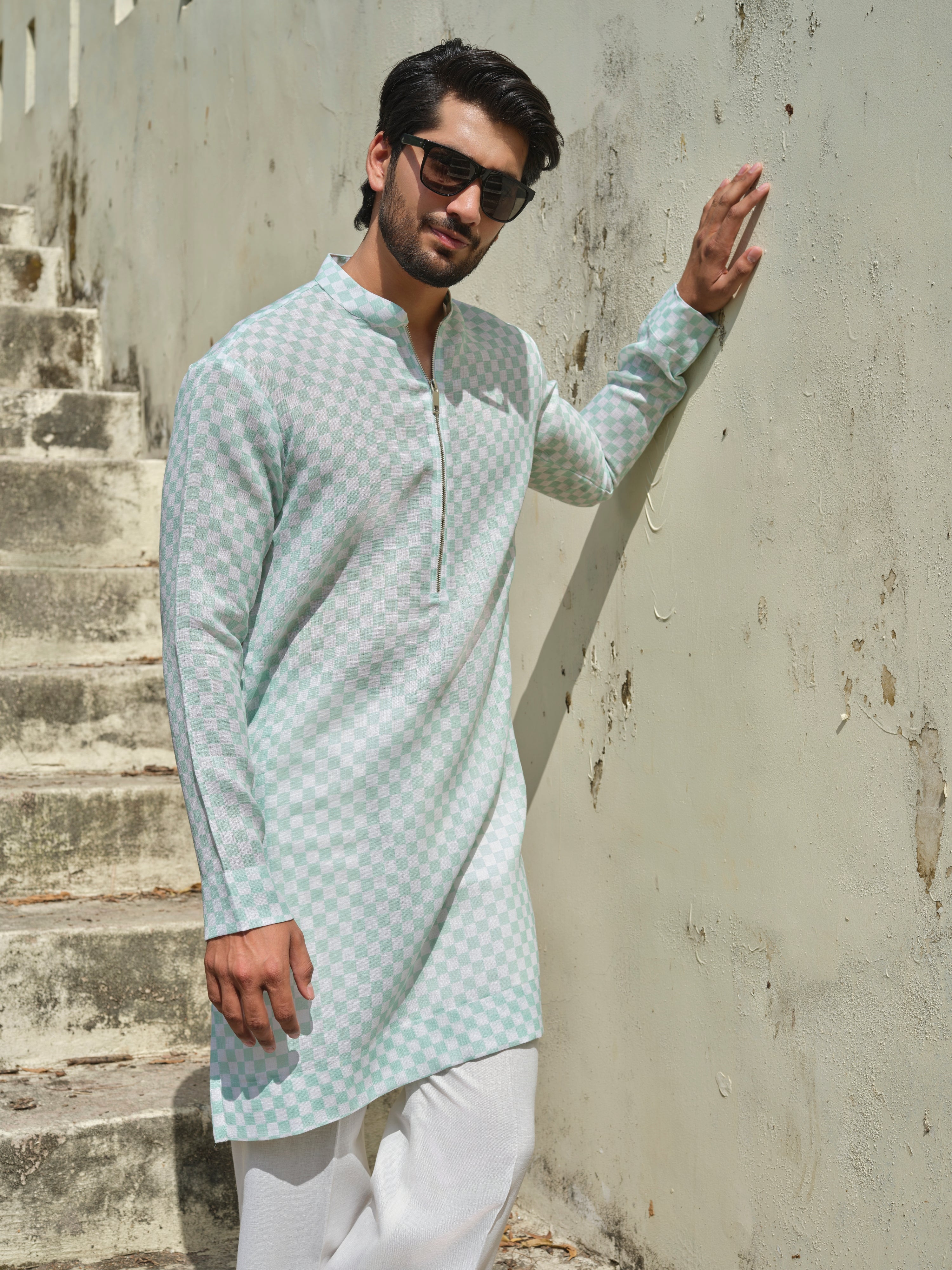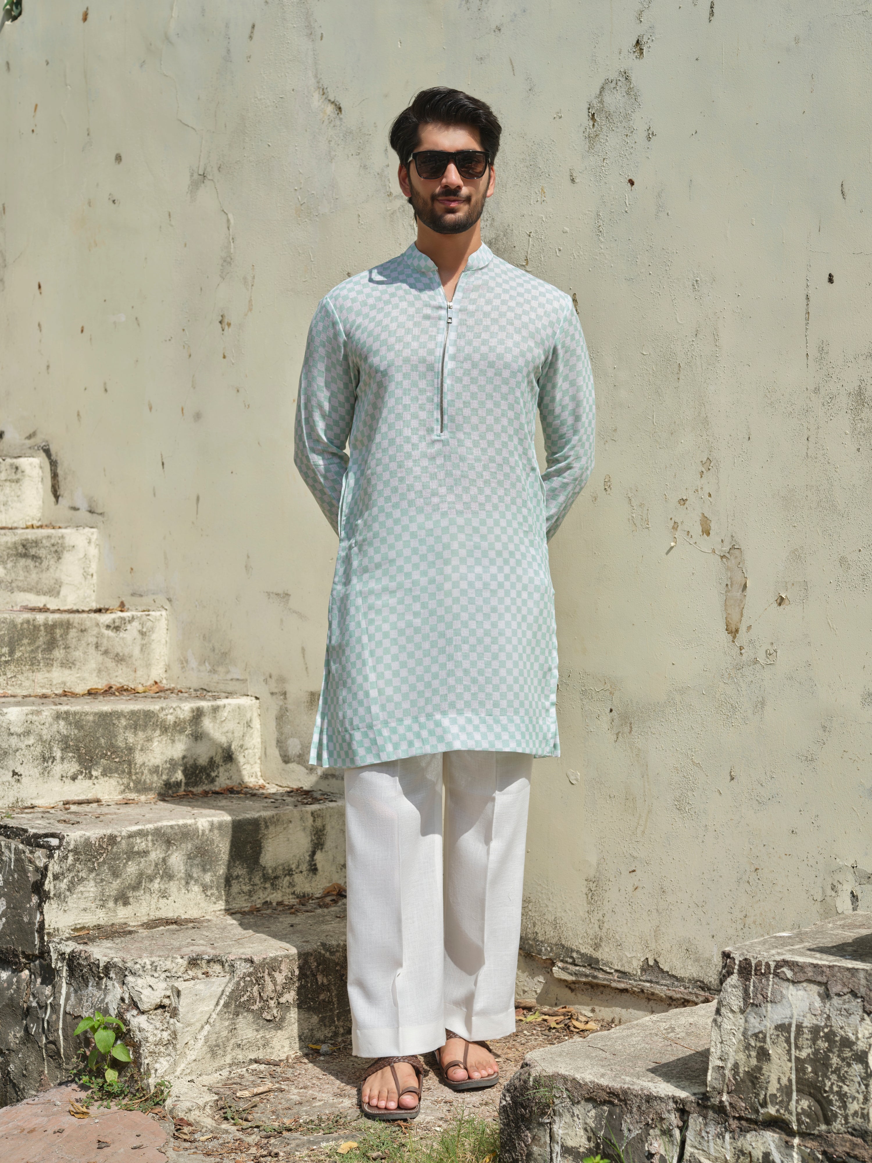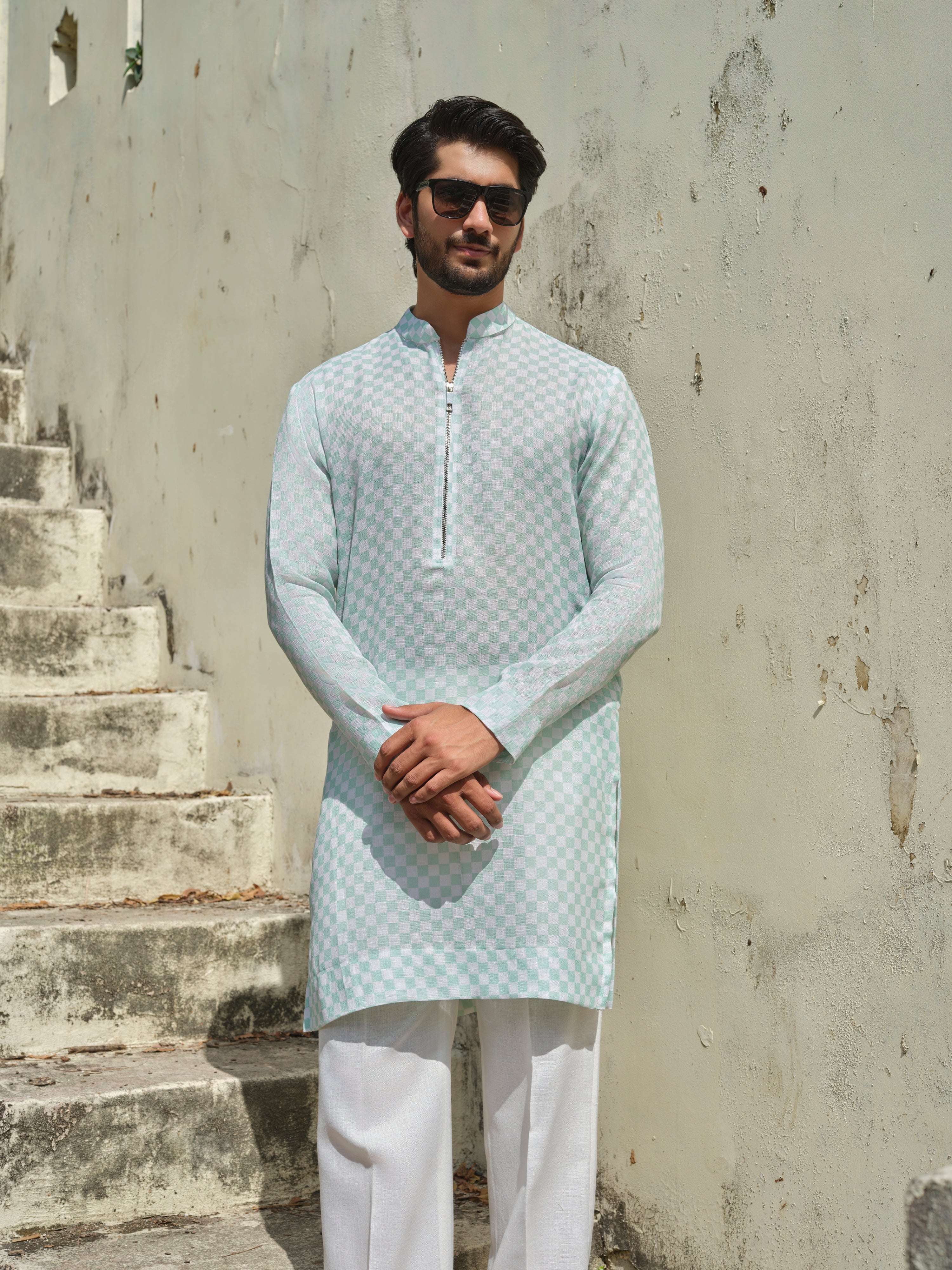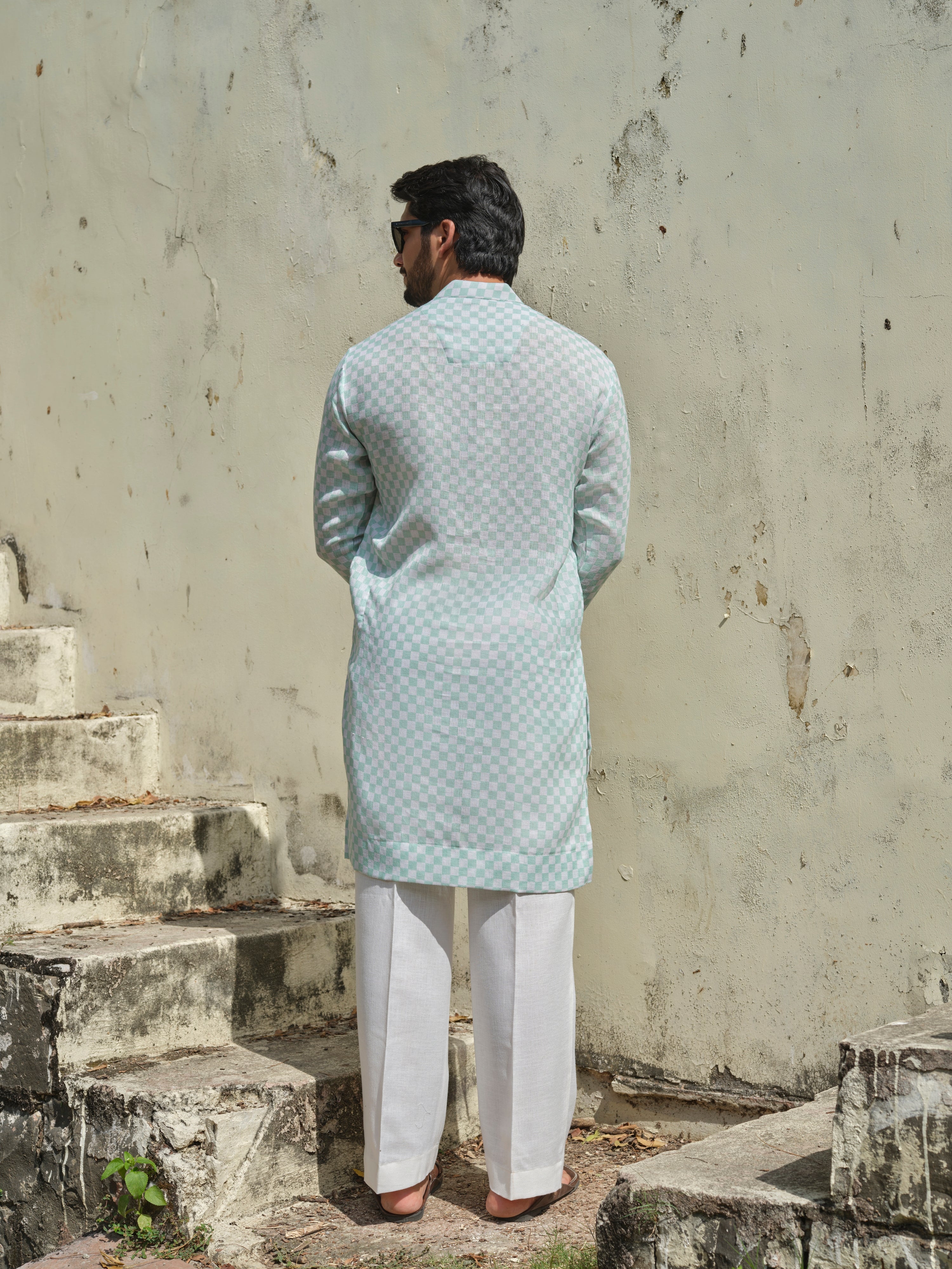 Woven in khadi-linen with precision checks, it’s the kind of kurta that goes from boardroom to brunch — no outfit change, no stress.